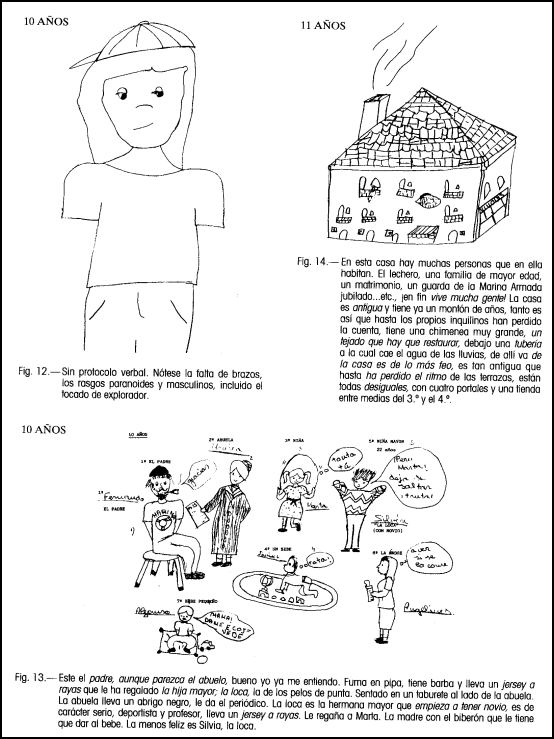 Esta serie de dibujos junto con los de los dos años siguientes (diez-once-doce años), forman una trilogía que corresponde a los peores momentos de los que fueron estudiados. El reforzamiento en los trozos, el abundante sombreado, el agrandamiento de los figuras, la expresión de los rostros ... hablan de una mala etapa para Ana. Los acontecimientos externos desorganizan su frágil estabilidad emocional junto a las expectativas de un nuevo papá real que llene el horizonte familiar de niños (fig. 13), aparecen los grandes temores y recelos, la incertidumbre y el miedo a la desorganización y confusión ("Barrotes en la ventana con un agujero para que salgan los humos" (fig. 11). "Un tejado que hay que restaurar" (fig. 14).