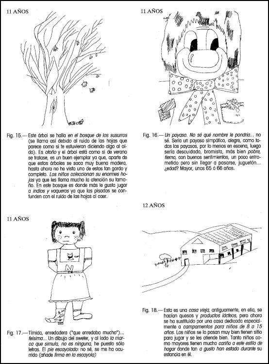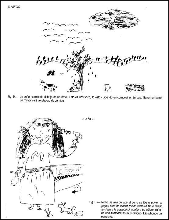 La secuencia de los dibujos informa por sí mismo. Comienza por un paisaje en el que junto a la armonía de los colores y buena distribución del espacio (aspectos más lúdicos y evolucionados), aparecen también las ramas truncadas, los frutos cayendo, la silla vacía y "un señor comiendo debajo de un árbol..., cuidando una vaca..., de mayor seré vendedora de comida". Las necesidades orales, de cuidado y de protección, se entrecruzan, disociadas, con los rasgos fobo-paranoides y las referencias al duelo por el objeto ausente al que es necesario incorporar (pájaro, trompeta) al menos en sus aspectos idealizados "para no tenerle miedo". María se reía porque el perro se iba a comer al pájaro para no tenerle miedo. También le tenía miedo la chica y le gustaba oír cantar a su pájaro -aspectos disociados e hipomaníacos: le tenía miedo y le gustaba" (figs. 5 y 6).