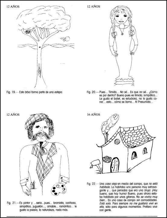 Las vivencias de vacío y los objetos internos persecutorios, afloran en su autopercepción (fig. 22: "Casa vieja, solo, la habita una persona muy extravagante, una bruja"), reavivándose las defensas hipomaniacas