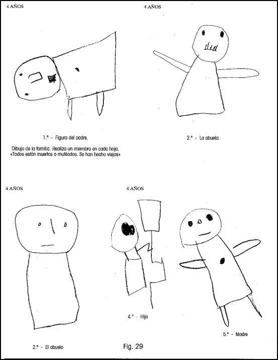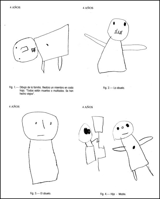 Dibujo una figura en cada hoja "todos están muertos o mutilados... por que todos se han hecho viejos". Dibuja en primer lugar al padre en posición horizontal "porque está muerto" y señala sus dientes como en la figura de la abuela. Los dibujos carecen de piernas y manos a excepción de la madre; la niña se aferra a un objeto acompañante y se dibuja en la mismo hoja con la madre, cuya figura aparece también muy inestable.