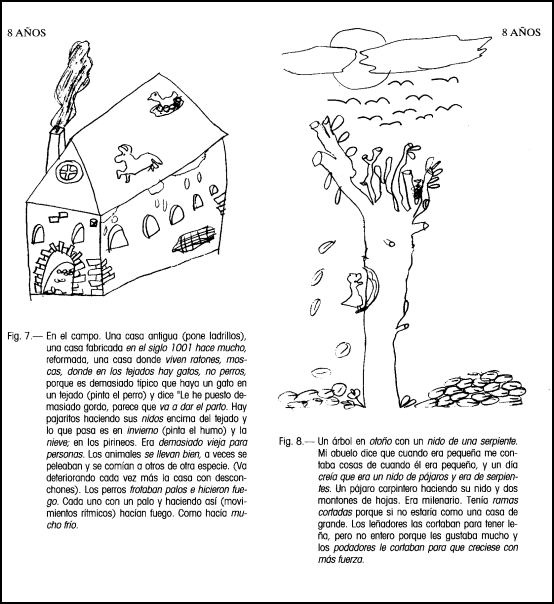 La falta de base de confianza (omisión o reforzamiento de la línea de base). La tendencia a la actuación y formaciones reactivas (dice una cosa y hace la contraria): "En el tejado hay gatos" pero pinta el perro de siempre). Los sentimientos de recelo, confusión y temor: "Creía que era un nido de pájaros y era de serpientes" "...Una casa donde viven ratones, moscas ... demasiado viejo para personas, mucho frío". (figs. 7 y 8). Los aspectos depresivos y contrafóbicos aparecen también en la necesidad de un objeto acompañante -el osito- que contrarreste sus temores y sentimientos de indefensión. (fig. 10).