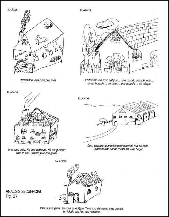 En todos los dibujos se mantienen la tridimensionalidad pero en perspectiva forzada, en escorzo, con reforzamiento de los contornos, elementos obsesivos e histeroides, ornamentación forzada, referencia a daños y erosiones en las superficies, sombreado en puedas y ventanas, tejados con elementos bizarros... Todos estos indicadores, en su conjunto, parecen hablar de una estructura borderline en la que, junto a los elementos depresivos y de inseguridad básica, se señalan también las dificultades en el proceso de pensamiento, las referencias a daños y rasgos de confusión en la identidad.