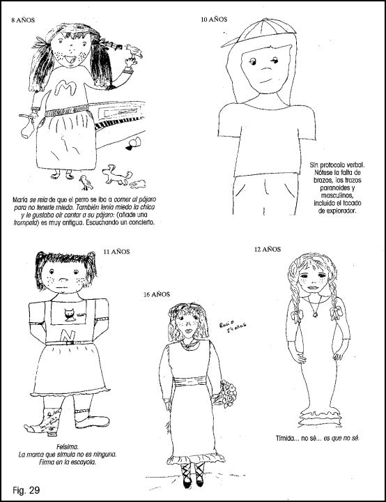 Los aspectos orales lúdicos y contrafóbicos (fig. 29, 1.ª), ceden paso a una progresiva rigidez de las figuras. Los contradicciones en la identidad (fig. 29, 2.º y 3.º), y la mayor afluencia de ansiedades paranoides (fig. 29, 2.ª, 3ª, 4,ª) desembocan en un falso self en el que el papel femenino se perfila como una postura obligado, falta de genuina vitalidad y valoración. Los adornos y las flores no ocultan la depresión en su rostro.