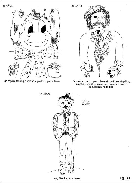 Resulta llamativo que, como en la serie de dibujos de los once años, la primera de los figuras humanas es la masculina,- todo es ropaje y su figura carece de identidad personal. Le atribuye los tópicos convencionales del hombre duro "supliendo con este rol y falso self idealizado la ausencia del modelo masculino en su vida real (fig. 24).