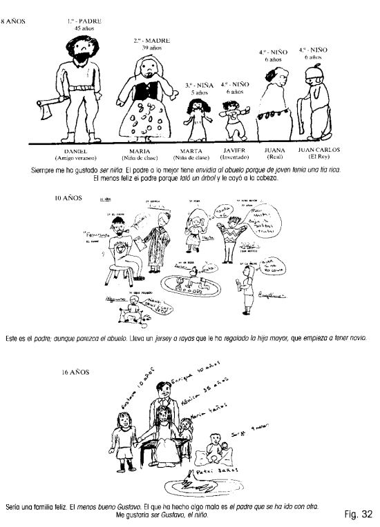 Desde el principio hasta el final la figura del padre ocupa el primer lugar de sus intereses. Pero de forma contradictorio: defectuoso y "muerto" (fig. 31, l.ª)., admirado en la fantasía y rechazado en la realidad como respuesta al abandono: es "el más malo" pero a ella le gustaría ser como él (fig. 32, 2.ª y 3.ª). En esta disociación se repiten las dificultades para configurar la imagen interna masculina y, por lo mismo, también la valoración de su propio rol femenino como mujer.