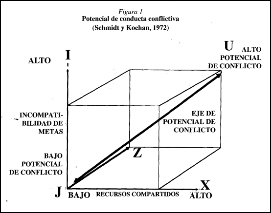 Esta reducción del conflicto al aspecto conductual permitió a Schmidt y Kochan distinguir entre conducta conflictiva y potencial de conflicto. El potencial de conflicto «dependería del grado en que las partes comparten los recursos deseados, del grado de interdependencia y de la incompatibilidad percibida de metas». Estas tres variables son de carácter continuo y su interrelación se pone de manifiesto en la Figura 1 en la que la diagonal J-U indica el potencial de conflicto y los ejes J1, J-Z y J-X la incompatibilidad de metas, la actividad interdependiente y los recursos compartidos respectivamente.