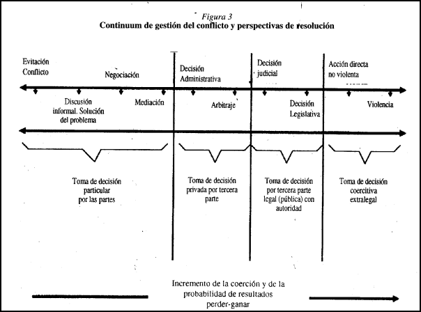 Moore (1986), en una línea de razonamiento muy similar a la que acabamos de exponer, establece un continuum en la gestión del conflicto y en las diversas perspectivas explicativas que se recogen en la Figura 3.