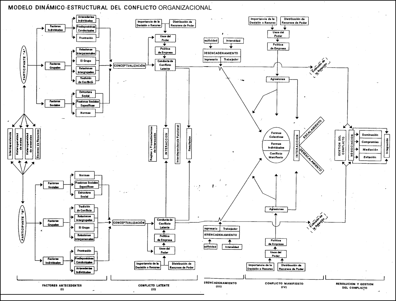 f) Cada conflicto tiene su propia historia particular que suele estar adornada por períodos de lucha abierta, de períodos de latencia, de escalamiento y de desescalamiento. En la figura 2 se recoge gráficamente el modelo dinámico-estructural del conflicto organizacional. En él se señalan las principales fases del desarrollo de un conflicto laboral y los grandes elementos que intervienen en el mismo (Fernández-Ríos, 1994).