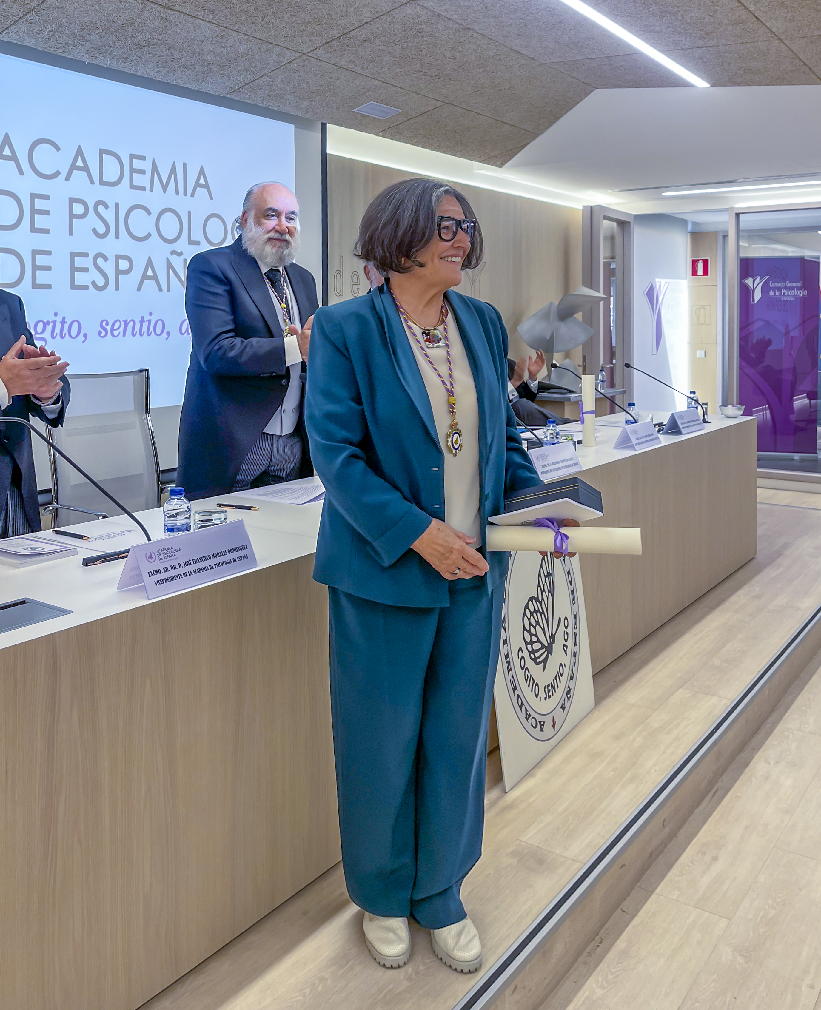En el acto de toma de posesión, donde recibió la Medalla nº 45 de manos de Heliodoro Carpintero, presidente de la APE, en reconocimiento a su trayectoria profesional y su contribución al desarrollo de la Psicología, leyó su discurso de ingreso titulado “Violencia y amor. La complejidad del desarrollo y la competencia socio-moral en la adolescencia”.