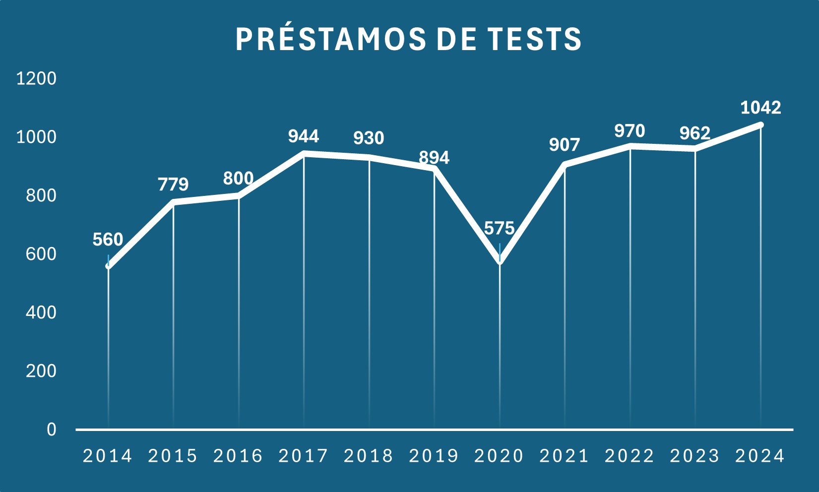 El Servicio de Préstamo de Tests se ofrece desde el año 2014, previo acuerdo con las editoriales de los tests, y, desde entonces, han usado el servicio 1.839 colegiados/as a los que se han realizado 9.326 préstamos. El servicio se abrió con 61 pruebas iniciales y en la actualidad están disponibles 150 tests diferentes, en su mayoría sobre la medición de aptitudes, inteligencia, funcionamiento neuropsicológico, personalidad, psicopatológica y dificultades de aprendizaje.