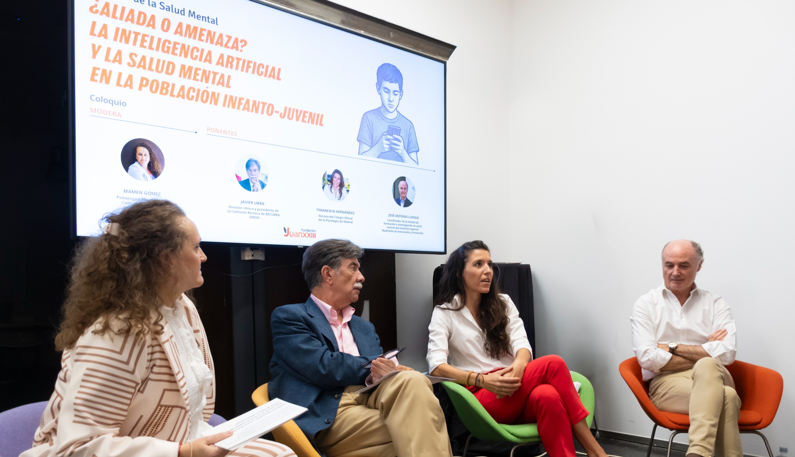 La Decana del Colegio, Timanfaya Hernández, intervino junto a Mamen Gómez, José Antonio Luengo y Javier Urra en la mesa redonda "¿Aliada o Amenaza? La inteligencia artificial y la salud mental en la población infanto-juvenil".