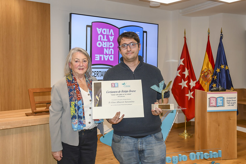 El segundo finalista fue Óscar García, por su relato “Una IA en terapia”. El premio fue entregado por María Antonia Álvarez-Monteserín, Presidenta de Honor del Colegio y Presidenta del Jurado del VIII Certamen de Relato Breve, tras lo cual el autor dedicó unas palabras de agradecimiento y leyó su obra.
