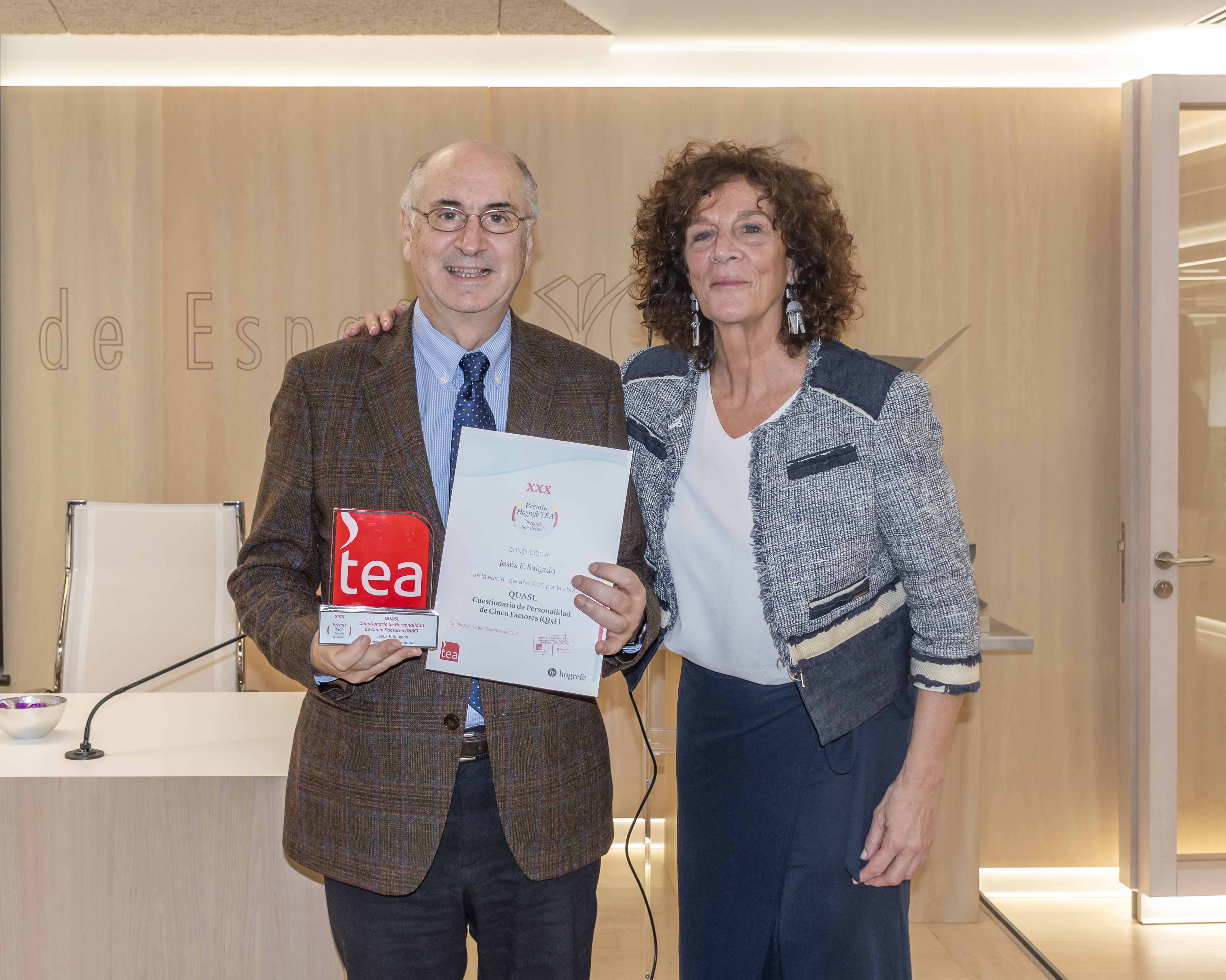 Premio TEA Ediciones, destinado a reconocer aportaciones relevantes al desarrollo de herramientas de evaluación psicológica en lengua española. En esta ocasión, el galardón fue concedido a Jesús Salgado, Catedrático de Psicología del Trabajo y RR.HH. en la Universidad de Compostela, por su obra «Cuestionario de elección forzosa cuasi-ipsativo de personalidad de cinco factores revisado (QI5F_tri)». De acuerdo con el jurado, este test supone un avance significativo en la evaluación de la personalidad, al emplear un formato de elección forzosa que reduce la deseabilidad social y mejora la precisión de las medidas, ofreciendo resultados más fiables y comparables. Se destacó su especial utilidad en contextos donde la objetividad resulta clave, como la evaluación del talento o los procesos de selección de personal.