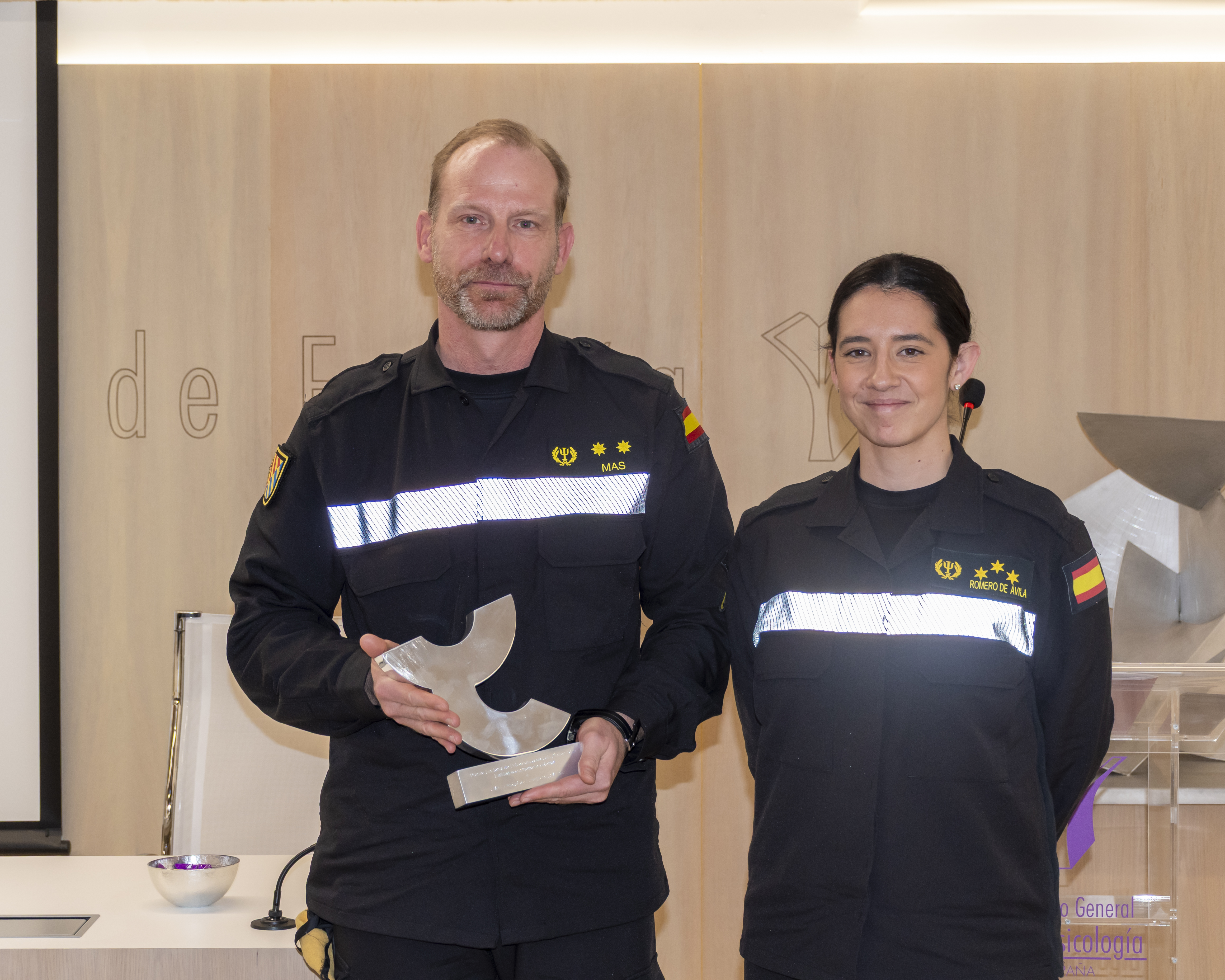 El Premio a la entidad socialmente excelente lo recibió la Unidad Militar de Emergencias (UME), en reconocimiento a la labor desarrollada por su sección de psicología en situaciones de emergencia. El galardón fue entregado por Francisco Santolaya Ochando y recogido por el teniente coronel y psicólogo colegiado de Madrid Jaime Mas Esquerdo y la capitana psicóloga Laura Romero de Ávila, quienes destacaron el trabajo realizado por los y las profesionales que les precedieron y el compromiso de la UME con la atención psicológica en contextos críticos.
