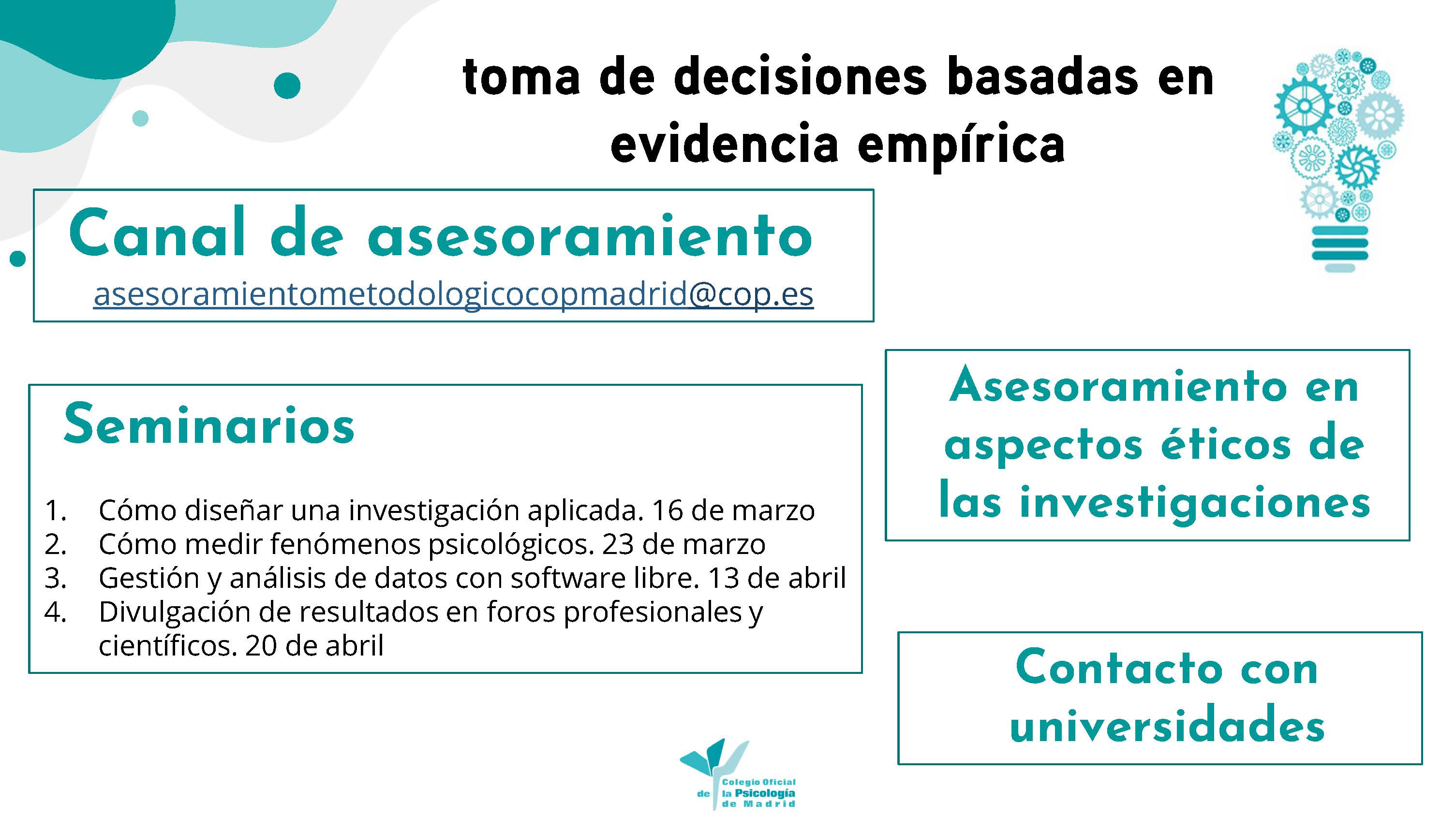 Cualquier persona colegiada o estudiante asociado/a puede contactar con la unidad a través del correo: asesoramientometodologicocopmadrid@cop.es