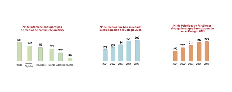 • En el año 2025 se han realizado 2.142 colaboraciones en diferentes medios de comunicación (2% de incremento). Estas intervenciones han sido realizadas por 229 profesionales de la Psicología divulgadores (6% de incremento).