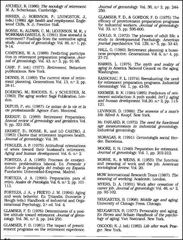 Considerándose al retiro la puerta que introduce en la última etapa de la vida, la ya abundante y generosa bibliografía que se ocupa de los aspectos psicosociológicos del retiro en lo que respecta a conceptualizaciones, teorías, metodología de investigación, modalidades de intervención y consejo, etc., coincide en la práctica con lo que habitualmente aparece en los textos, publicaciones y revistas dedicadas a Psicogerontología o Gerontología Social. Se insiste y de ello se ocupan en buena parte los programas específicos de preparación para el retiro, en lo que será la vida del jubilado y la problemática que como viejo tendrá que abordar: superación de la crisis, cambio de roles, repercusiones en la salud física y mental, limitaciones impuestas por la edad, requisitos para una buena adaptación, estereotipos y prejuicios que hay que vencer, formas de integración, aprovechamiento del tiempo libre, actividades adecuadas pasada la jubilación, etc. (en una publicación reciente del título similar. Forteza 1990, me he ocupado mas detenidamente de algunas de estas cuestiones y a ella remito a los lectores interesados).