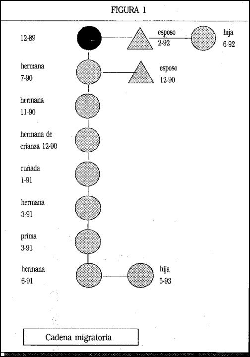 Estas han sido fundamentales para entender el proceso de expansión de la comunidad inmigrante. El proceso podemos describirlo de forma sencilla: "María llega a Madrid porque una amiga le dice que hay un trabajo para ella en una casa cerca de la que ella trabaja, una vez asentada manda dinero para que venga su hermana. Entre las dos van a ahorrar dinero para poder traer a sus otras dos hermanas, una vez asentadas las cuatro han ido trayendo a diferentes familiares hijas, cuñadas y esposos. De esta forma se constituye una cadena migratoria que va teniendo cada vez más eslabones, y que por otro lado en el país de inmigración constituye toda una red de apoyo social. (Ver fig. l.)