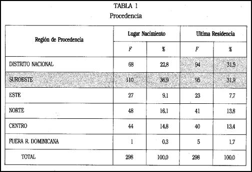 Una de las características más relevantes, es que estas mujeres provienen en su mayor parte de la región Suroeste del país, aunque también es significativo el número de mujeres que vienen desde la capital (Distrito Nacional). En la tabla 1 podemos observar, como las que han nacido en el Suroeste del país constituyen el porcentaje mayor con un 36,9 %, es decir, más de una tercera parte. Cuando nos referimos a la última residencia antes de emigrar, se igualan prácticamente las procedentes del Distrito Nacional y las de la región Suroeste. La emigración, en el caso de las mujeres que provienen del Suroeste del país, se ha producido directamente a España, desde sus pequeñas comunidades rurales hasta Madrid, aproximadamente el 95 % ha usado esta fórmula.