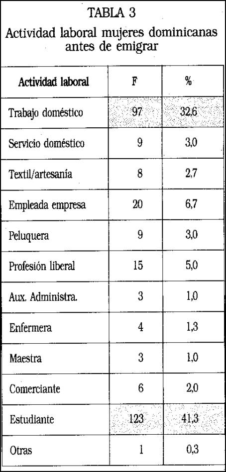 Las mujeres que han emigrado y que tienen cargas familiares siempre dejan a otras mujeres realizando su trabajo: abuelas, hijas, hermanas o pagan a una mujer para que lo realice. En algún momento de sus vidas, estas mujeres pobres han trabajado como empleadas de hogar, a edades tempranas a cambio de comida y vestido en los núcleos urbanos para la clase alta dominicana, pero en el momento de salir de su país sólo un 3 % realizaba este tipo de trabajo. (Ver tabla 3.)