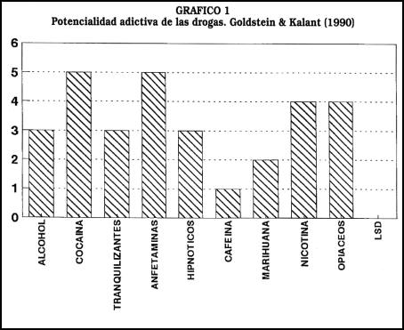 6 El gráfico sobre la capacidad adictiva de las drogas esta extraído del artículo de Goldstein & Kalant reseñado en la bibliografía. Dicho artículo consiguió una carta de respuesta de Hollister y otros (1991), debido a que inicialmente el LSD y otros alucinógenos habían sido considerados con potencialidad adictiva. Goldstein & Kalant aceptaron la crítica e indicaron que no deberían haber sido incluidos en esa lista. En el artículo se dan 5 rangos de capacidad adictiva, la mayor tiene rango 1, y el menor 5, En el gráfico hemos invertido los rangos, así el 5 es a la sustancia más adictiva y el 1 a la menor.