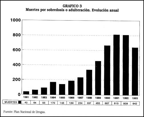 Según la evolución expresada en el gráfico adjunto el número de muertes se incrementó vertiginosamente desde 1985 hasta 1991, y descienden en 1993. La mayoría de estas muertes son atribuidas al uso de heroína callejera, y hay un acuerdo general en que son muertes involuntarias, no son suicidios 7 (Gráfico 3).