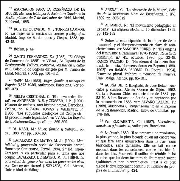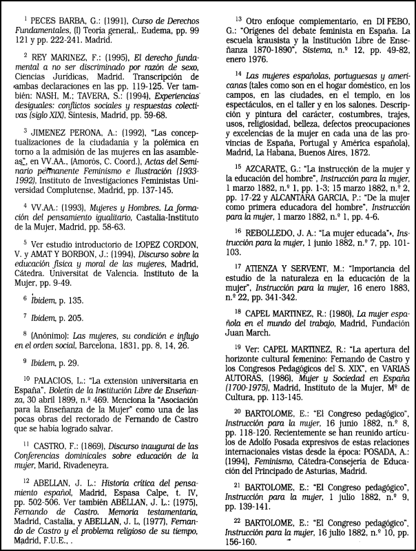 - "¿El hombre más inepto es superior a la mujer más inteligente"..."si al hombre apto no se le prohibe el ejercicio de una profesión porque hay algunos ineptos, ¿por qué no se ha de hacer lo mismo con la mujer? No creemos que pueden fijarse límites a la aptitud de la mujer, ni excluirla a priori de ninguna profesión, como no sea la de las armas, que repugna a su naturaleza, y ojalá que repugnara a la del hombre!" 31.