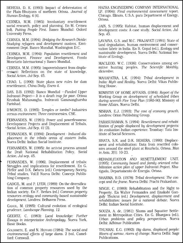 Solamente en la India, hasta 1990 había 21.300.000 personas desplazadas por uno u otro proyecto de desarrollo (Fernandes, 1994, p. 24). Sin lugar a dudas, la gran mayoría de ellas son miembros de tribus. De un total de 7.410.000 miembros de tribus desplazados, solamente un 24.9 por cien han sido rehabilitados y un increíble 75.03 por cien de las tribus desplazadas aguardan la rehabilitación (Fernandes, 1991). El grupo de trabajo sobre las Development and Welfare of Schedule Tribes durante el octavo Plan Quinquenal (1990-95) informa que de un total de 1.694.000 de desplazados en los 110 proyectos estudiados, 814.000 (el 48 por cien) eran miembros de tribus (Trukral, 1992, p. 8). Las tribus, han vivido tradicionalmente en una economía de subsistencia autosuficiente, dependiente de los recursos naturales. Están relativamente menos expuestos a la economía de fuera de su región. Excepto en el nordeste y en algunas partes de Chotanagpug, la alfabetización es extremadamente baja. Como consecuencia no pueden esperar conseguir muchos puestos de trabajo en el nuevo proyecto. Si consiguen algún trabajo, están limitados a las categorías de los no cualificados y temporales, incluso como jornaleros (Fernandes, 1996).