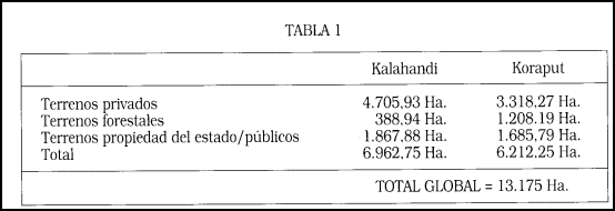 Respecto a beneficios, habría 600 megavatios de electricidad y el regadío de 12.800.000 hectáreas de terrenos agrícolas en la zona de influencia, en el distrito de Kalahandi, propenso a la sequía de forma permanente. Con ello se incrementaría la producción agrícola y como consecuencia las oportunidades de empleo y el crecimiento del sector de servicios. Ha proporcionado empleo fijo adicional a alrededor de 248 personas de entre las familias desplazadas, en diversos puestos del proyecto. Como asunto de decisión de política, las principales agrupaciones de asentamientos formados por las familias desplazadas, serán electrificadas por el Orissa State Electricity Board. El almacenamiento de agua en el embalse creará un enorme potencial de pesca (captura). Las familias desplazadas establecidas en la periferia de los lugares embalsados podrán adoptar esta profesión como principal fuente de subsistencia. Se harán esfuerzos para enlazar esto con el proyecto de cultivo de la gamba y el pescado, bajo el programa patrocinado por el Banco Mundial. La única pérdida que lamenta el gobierno es el desplazamiento de 17.000 personas debido a la construcción del embalse [Informe del Resettlement and Rehabilitation Unit Khatiguda (en adelante RRU), 1995:31. Sin embargo, el Orissa Kurshak Mahasangh y el Indravati Gana Sangharsha Parishad señalan la cifra de 30.000 en los distritos de Kalahandi y el de Koraput íntegro. Aún más, el proyecto ha adquirido 13.175 hectáreas de tierra, 6.962,75 y 6.212.25 hectáreas de los distritos de Kalahandi y del total de Koraput, respectivamente (RRU, 1995, p.4). En la Tabla 1 se detallan los diversos tipos de terrenos.
