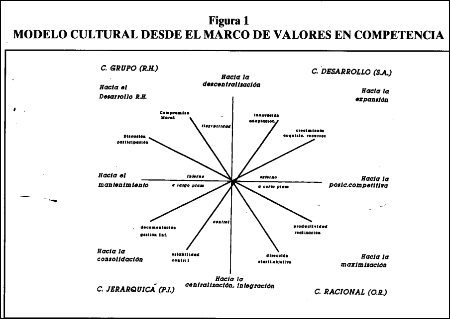 En la figura 1 se representa esquemáticamente el marco sobre el que se basa el modelo de valores en competencia de la cultura organizacional. El primer eje refleja las demandas de cambio y estabilidad; un extremo del eje representa la flexibilidad y espontaneidad y el otro la estabilidad y el control. Esta dimensión guarda cierta semejanza con lo que en teoría organizacional se ha venido denominando formas mecánicas vs. formas orgánicas de la organización. El segundo eje refleja demandas opuestas originadas por la organización y el entorno. Un extremo refleja la armonía, integración para mantener la organización existente mientras que el otro extremo representa la competición, adaptación e interacción con el, entorno. De la interacción de estos dos ejes emergen cuatro tipos culturales: cultura de grupo, cultura de desarrollo, cultura racional y cultura jerárquica.