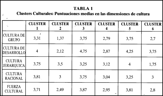 En la tabla 1 se presentan los seis clusters resultantes y la media de las puntuaciones de los sujetos de cada cluster para cada una de las dimensiones de cultura consideradas. Los clusters 1, 3, y 5 son los que presentan una media global más alta. Para una mejor diferenciación -entre ellos los nombraremos atendiendo a las dimensiones culturales que presentan puntuaciones más altas. El cluster 1 agrupa empresas con fuertes culturas de desarrollo y racionalidad ("fuerza cultural en desarrollo y reacionalidad") el cluster 3 lo integran empresas con un fuerte énfasis en el desarrollo ("fuerza cultural en desarrollo") y el cluster 5 integrado por empresas que enfatizan el desarrollo y la jerarquía ("fuerza cultural en desarrollo y jerarquía.).