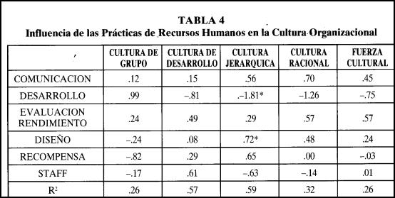 La tabla 4 da cuenta de la influencia que los RH tienen en la cultura. Estos explican el 26% de la varianza en la cultura de grupo, el 57% de la varianza en la cultura de desarrollo, 59% en la cultura jerárquica y el 32% en la cultura racional. Con respecto a la fuerza cultural de las empresas, las prácticas de RH dan cuenta del 26% de la varianza. En general, las prácticas de RH explican una cantidad considerable de varianza en los tipos y fuerza cultural. La hipótesis 3a se ve así apoyada de forma general.
